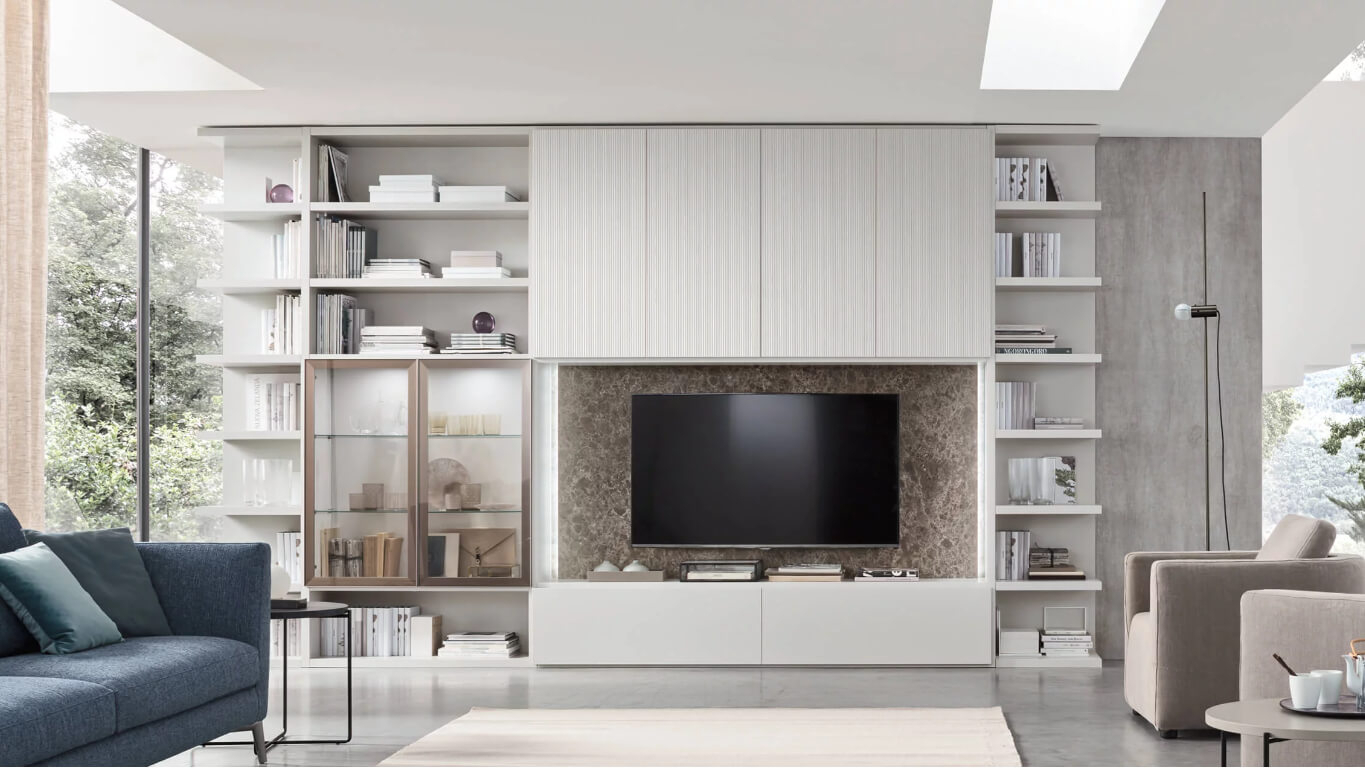 Schienale TV: Melaminico marmo Ash Stone / Frontali ante: Millerighe opaco Ghiaccio