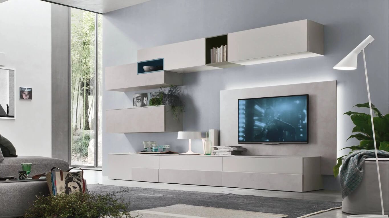 Base e pensili: Melaminico colore Ghiaccio e Melaminico cemento Grigio