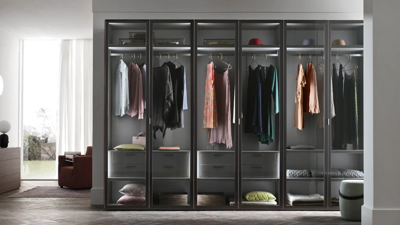 Glax è l’armadio tutto vetro che amplia la percezione di spazio nella zona notte, con uno stile arioso e moderno. Le ante a battenti sono in vetro temperato trasparente o satinato, bronzo o fumé, incorniciate da un telaio in alluminio spazzolato. I fianchi sono disponibili in tutte le finiture e i colori delle cartelle melaminici e laccati. L’interno a vista, completamente personalizzabile, definisce gli spazi contenitivi e valorizza la luminosità della camera da letto, con dettagli funzionali e illuminazione a LED.