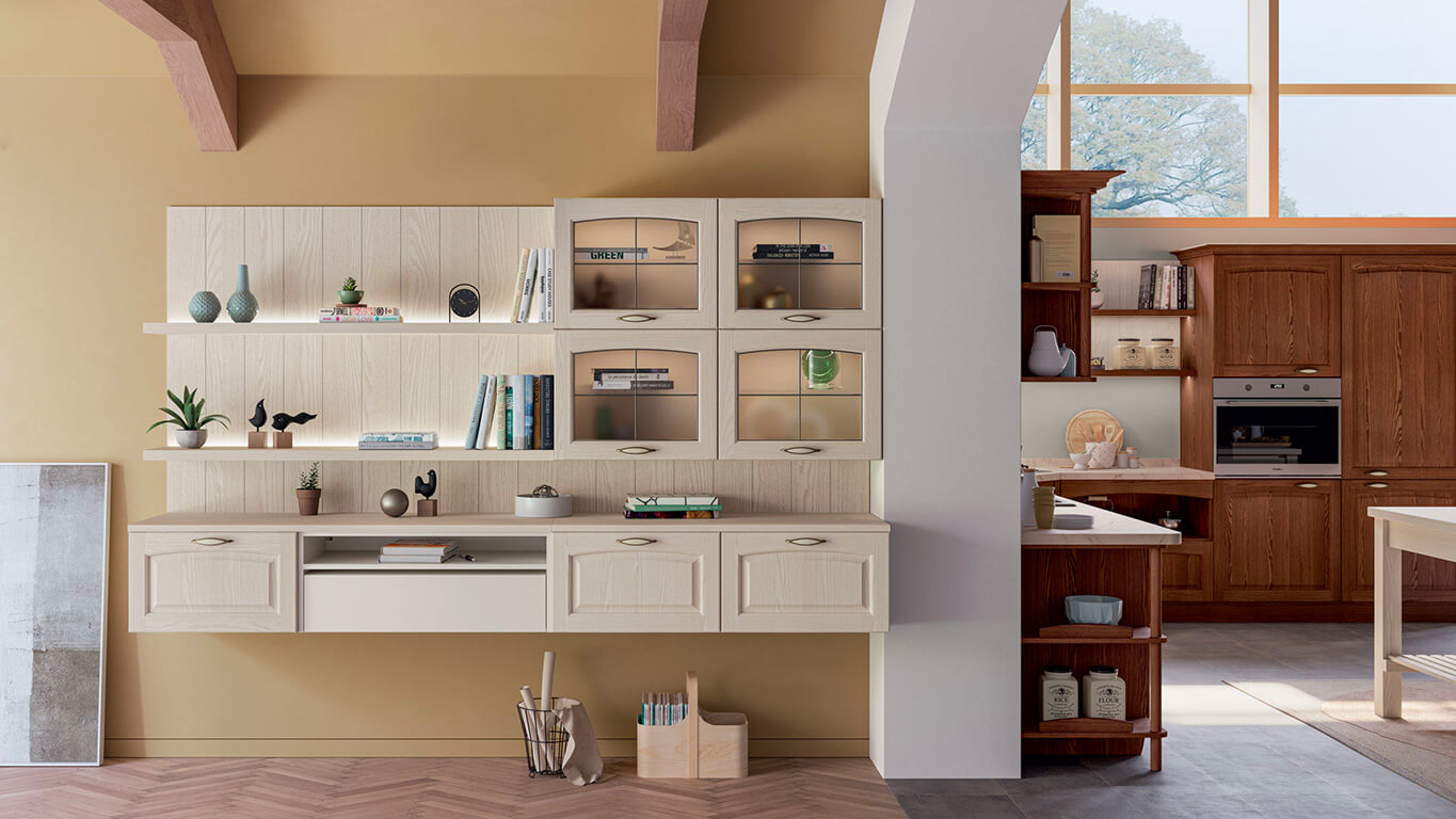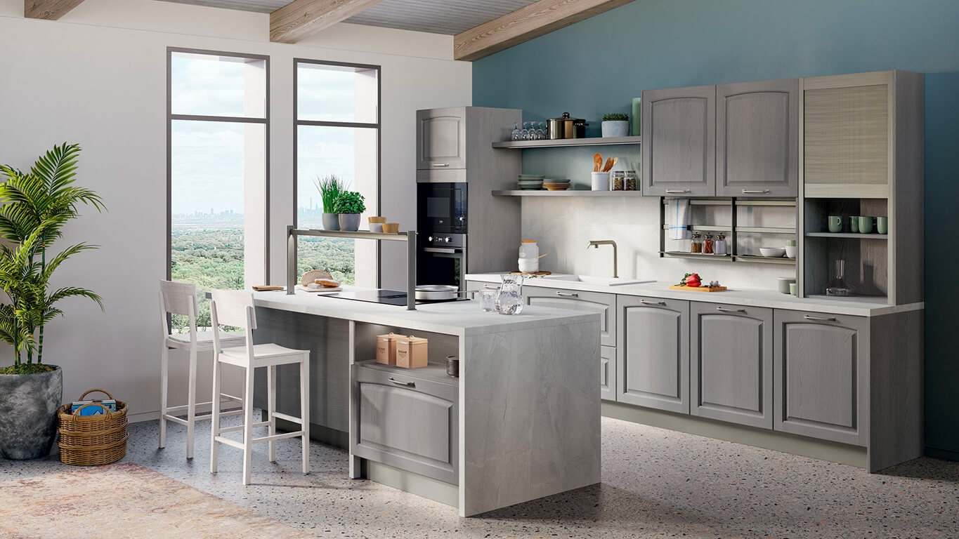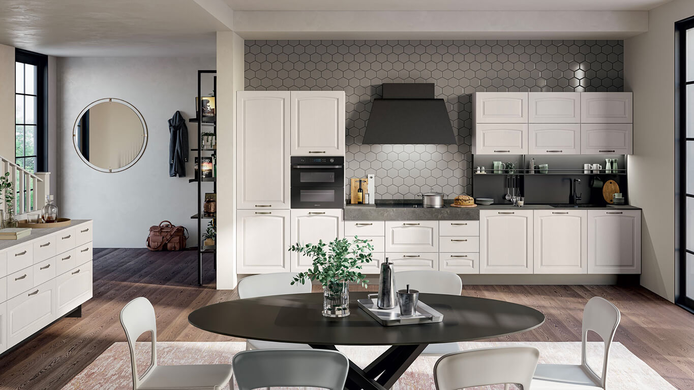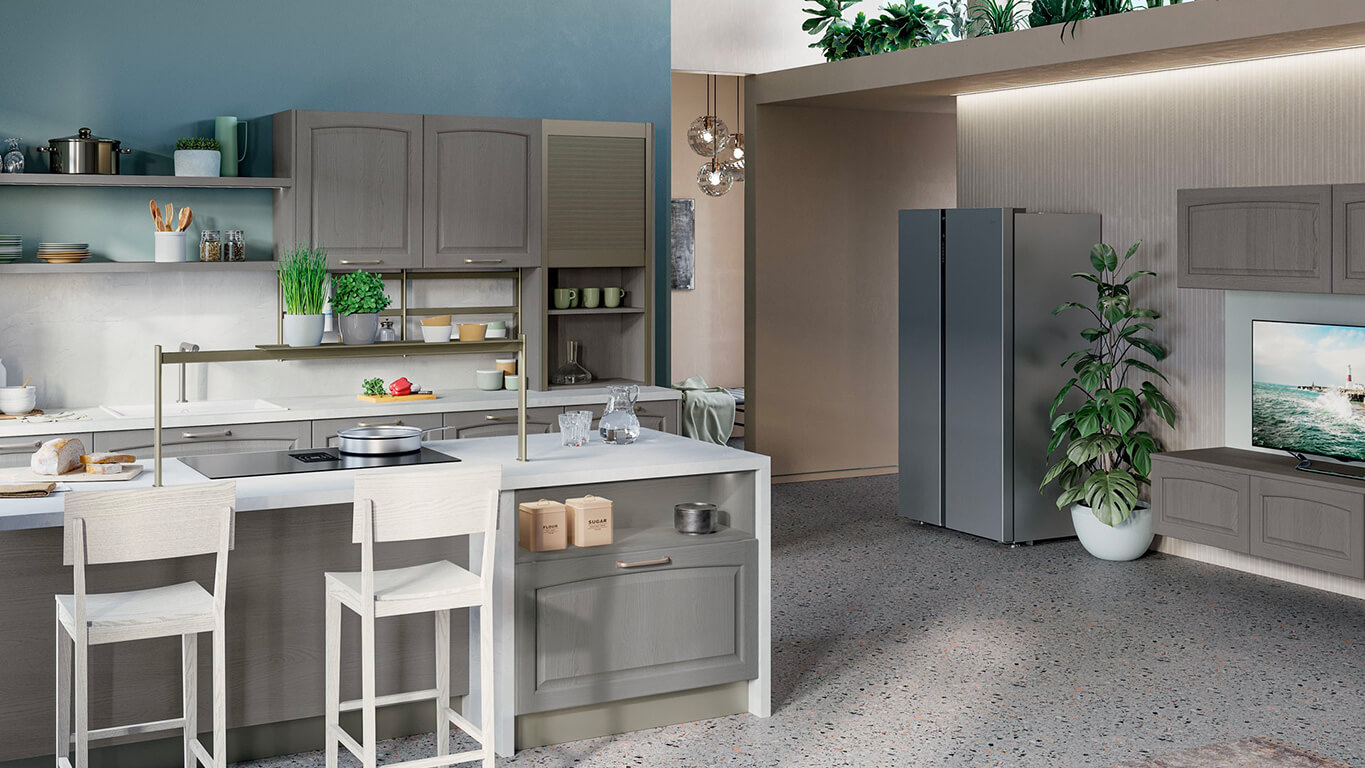 Cucina e living in una composizione che si esprime in due funzioni, operatività e socialità. Il bello di cucinare e stare insieme in un unico spazio
